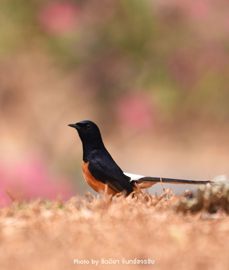 นกขนาดกลาง ลำตัวเพรียวยาวคล้ายนกกางเขนบ้าน แต่มีหางที่ยาวกว่า หัว อก ปีก และหลังสีดำ ท้องสีน้ำตาลแดงสด สะโพกสีขาว หางยาวมีขอบขนหางคู่นอกสีขาว เพศเมียมีสีซีดกว่า และหางสั้นกว่า