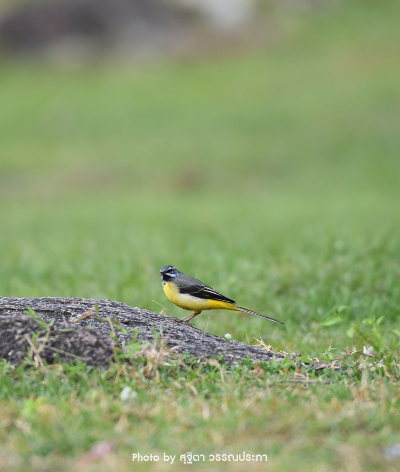 นกขนาดเล็ก ลำตัวเพรียวยาว หางยาว มีคิ้วสีขาวลากผ่านเหนือตา หน้าผากและลำตัวด้านบนสีเทาดำ ปีกสีดำมีลายขาวพาด สะโพกสีเหลือง หางยาวด้านบนสีดำด้านล่างมีขอบสีขาว ลำตัวด้านล่างสีเหลืองอ่อน คอสีขาว