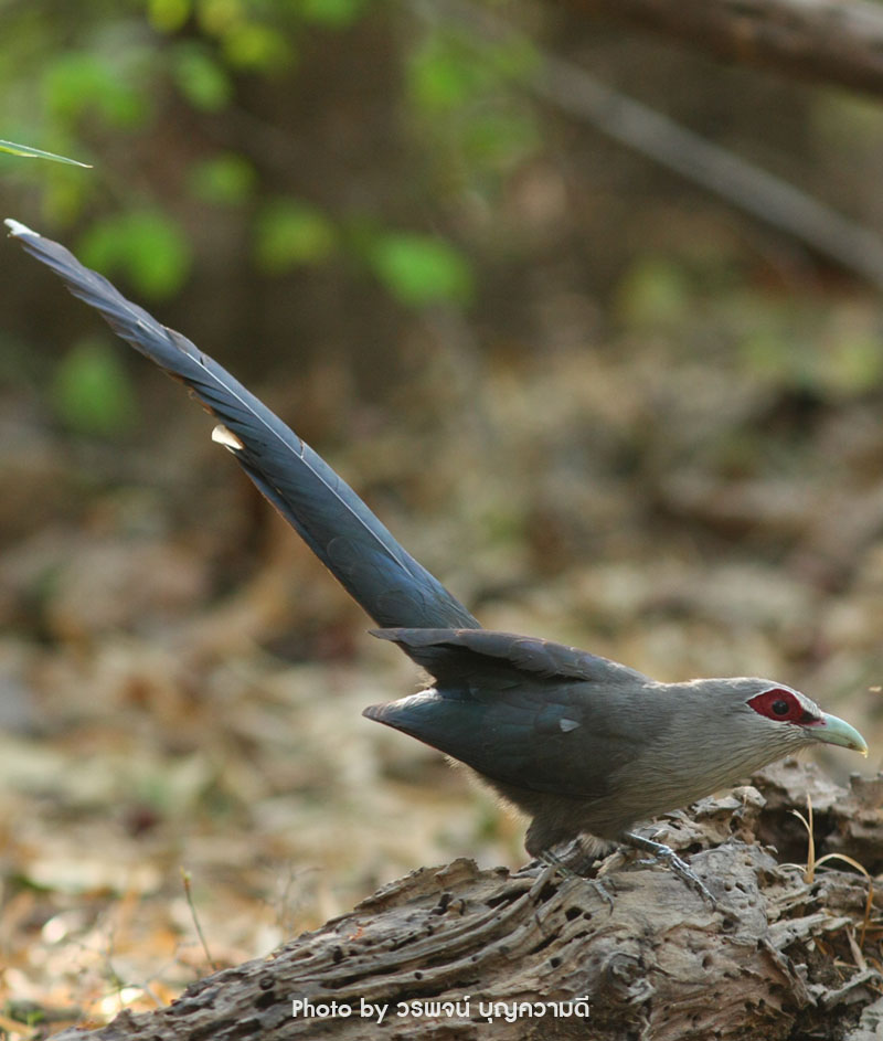นกขนาดกลาง ลำตัวเพรียวยาว หางยาวมากเห็นได้ชัดเจนขณะบิน ปากสีเขียว หัวสีเทา รอบตามีหนังสีแดงสด หลังและปีกสีเทาดำ หางด้านบนสีดำ คอและอกสีเดียวกับหัว ท้องสีเทาเข้ม มีบั้งสีขาวใต้หาง